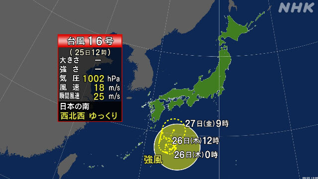 | 【台風情報】台風16号『ノロノロ』進み…日本の南海上へ 27日に熱帯低気圧となり北上か…新たな熱帯低気圧”台風のたまご”の可能性も?【気象庁の進路予想 台風最新・雨風シミュレーション】 …日本の南海上で発生した台風16号。26日正午時点で、台風16号の中心は日本の南海上にあり、西へゆっくりと進んでいるということです。 中心気圧は100… (出典:MBSニュース) |